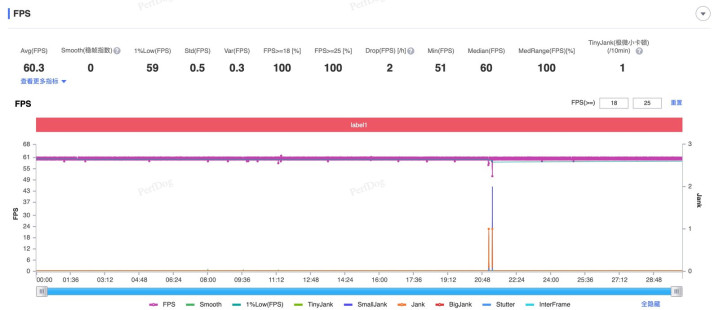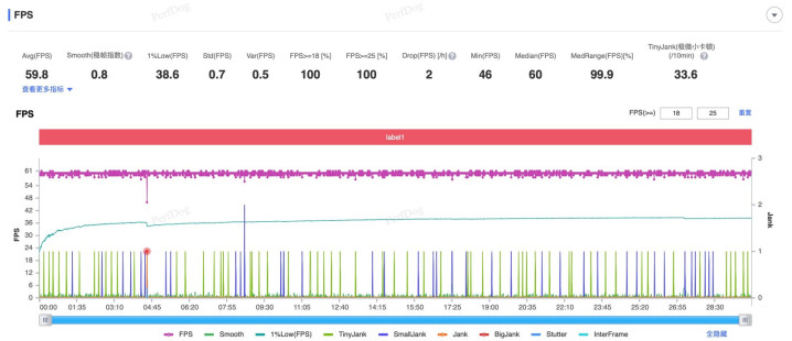 来看看《原神》的表现,将画质调整至最高+60帧,半小时须弥城跑图平均帧率60.3帧,功耗4.3W,1%Low帧更是来到59帧,游戏表现平稳流畅。