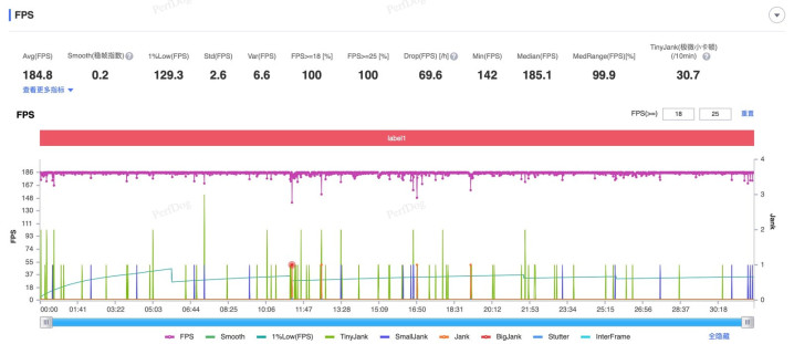 而在帧率表现上,在游戏内将画质调整至极高+185帧,半小时爆破模式下去除中间换局的匹配环节,荣耀WIN的平均帧率为184.8帧,功耗3.9W,机身正面温度44.2度,背面温度39.1度,表现也非常优秀。